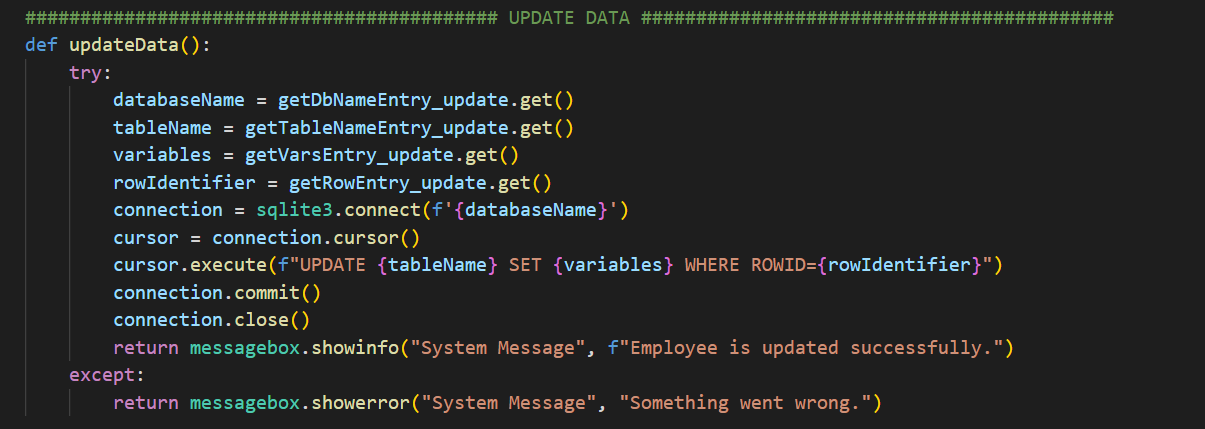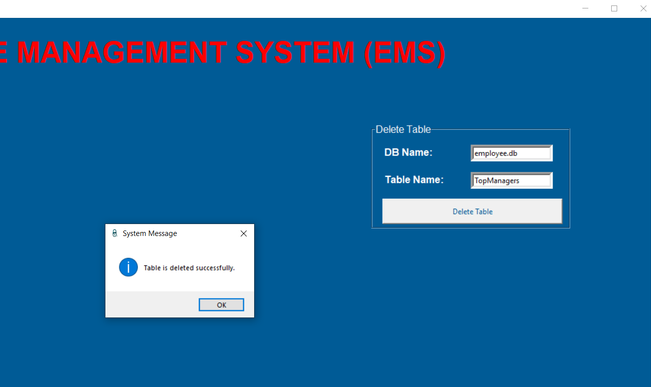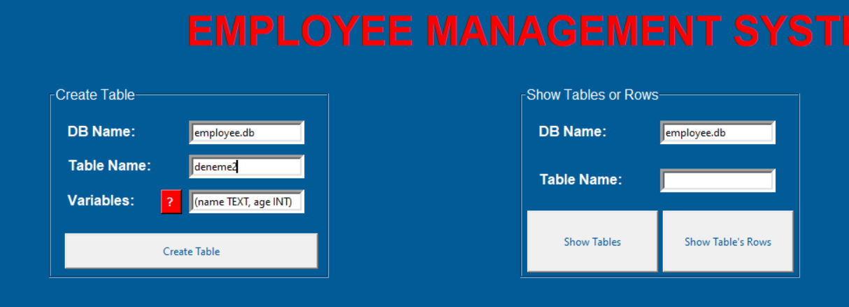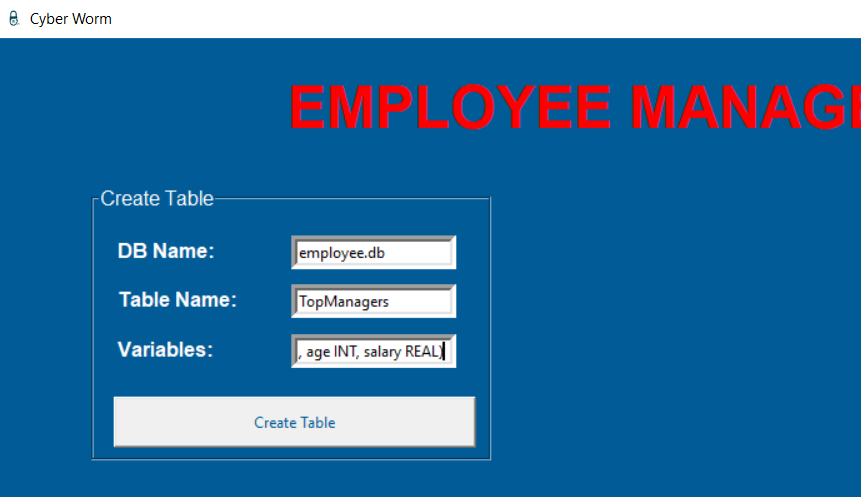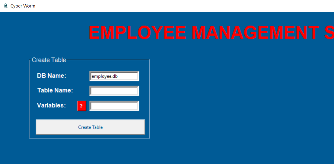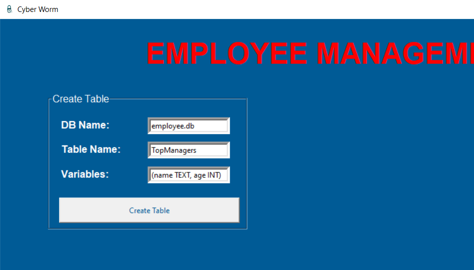 employee.pyfrom tkinter import *from tkinter import messageboximport sqlite3import webbrowser as websystem = Tk()system.geometry("1920x1080")system.title("Cyber Worm")system.iconbitmap("C:/Python/EMS/logo.ico")system.configure(bg="#005b96")#system.attributes('-fullscreen', True)defaultDatabase = StringVar()defaultDatabase.set("employee.db")titleLabel = Label(system, text="EMPLOYEE MANAGEMENT SYSTEM (EMS)", bg='#005b96', fg='red', font=('Arial', 35, 'bold'))titleLabel.place(relx=0.15, rely=0.03)########################################### CREATE TABLE AND ADD VARIABLE ###########################################def createTableMethod(): try: databaseName = getDbNameEntryCREATE.get() tableName = getTableNameEntryCREATE.get() variables = getVariablesEntryCREATE.get() connection = sqlite3.connect(f'{databaseName}') cursor = connection.cursor() cursor.execute(f"CREATE TABLE IF NOT EXISTS {tableName} {variables}") connection.commit() connection.close() return messagebox.showinfo("System Message", "Table is created successfully.") except: return messagebox.showerror("System Message", "Something went wrong.")createTableFrame = LabelFrame(system, text="Create Table", fg='white', bg='#005b96', font=('Arial', 12), height=220, width=320)createTableFrame.place(relx=0.05, rely=0.14)getDbNameEntryCREATE = Entry(createTableFrame, textvariable=defaultDatabase, border=5)getDbNameEntryCREATE.place(relx=0.5, rely= 0.1)getDbNameLabelCREATE = Label(createTableFrame, text="DB Name:", bg='#005b96', fg='white', font=('Arial', 12, 'bold'))getDbNameLabelCREATE.place(relx=0.05, rely=0.1)getTableNameEntryCREATE = Entry(createTableFrame, border=5)getTableNameEntryCREATE.place(relx=0.5, rely= 0.3)getTableNameLabelCREATE = Label(createTableFrame, text="Table Name:", bg='#005b96', fg='white', font=('Arial', 12, 'bold'))getTableNameLabelCREATE.place(relx=0.05, rely=0.3)getVariablesLabelCREATE = Label(createTableFrame, text="Variables:", bg='#005b96', fg='white', font=('Arial', 12, 'bold'))getVariablesLabelCREATE.place(relx=0.05, rely=0.5)getVariablesEntryCREATE = Entry(createTableFrame, border=5)getVariablesEntryCREATE.place(relx=0.5, rely= 0.5)helpButtonCREATE = Button(createTableFrame, text="? ", font=('Arial', 10, 'bold'), bg='red', fg='white', \ command=lambda : messagebox.showinfo("Usage", "USAGE: (<variable name> <data type>,...)\ \nYou can take support from your manager."))helpButtonCREATE.place(relx=0.4, rely=0.5)createTableButton = Button(createTableFrame, text="Create Table", fg='#005b96', width=40, height=2, command=createTableMethod)createTableButton.place(relx=0.05, rely=0.75)########################################### CREATE TABLE AND ADD VARIABLE ###################################################################################### DELETE TABLE ###########################################def dropTable(): try: databaseName = getDbNameEntry_DropTable.get() tableName = getTableNameEntry_DropTable.get() connection = sqlite3.connect(f'{databaseName}') cursor = connection.cursor() cursor.execute(f"DROP TABLE {tableName}") connection.commit() connection.close() return messagebox.showinfo("System Message", "Table is deleted successfully.") except: return messagebox.showerror("System Message", "Something went wrong.")dropTableFrame = LabelFrame(system, text="Delete Table", fg='white', bg='#005b96', font=('Arial', 12), height=170, width=320) dropTableFrame.place(relx=0.7, rely=0.2)getDbNameEntry_DropTable = Entry(dropTableFrame, textvariable=defaultDatabase, border=5)getDbNameEntry_DropTable.place(relx=0.5, rely= 0.1)getDbNameLabel_DropTable = Label(dropTableFrame, text="DB Name:", bg='#005b96', fg='white', font=('Arial', 12, 'bold'))getDbNameLabel_DropTable.place(relx=0.05, rely=0.1)getTableNameEntry_DropTable = Entry(dropTableFrame, border=5)getTableNameEntry_DropTable.place(relx=0.5, rely= 0.4)getTableNameLabel_DropTable = Label(dropTableFrame, text="Table Name:", bg='#005b96', fg='white', font=('Arial', 12, 'bold'))getTableNameLabel_DropTable.place(relx=0.05, rely=0.4)dropTableButton = Button(dropTableFrame, text="Delete Table", fg='#005b96', width=40, height=2, command=dropTable)dropTableButton.place(relx=0.05, rely=0.69)########################################### DELETE TABLE ###################################################################################### DELETE ROW ###########################################def deleteRow(): try: databaseName = getDbNameEntry_DeleteRow.get() tableName = getTableNameEntry_DeleteRow.get() rowIdentifier = getRowEntry_DeleteRow.get() connection = sqlite3.connect(f'{databaseName}') cursor = connection.cursor() cursor.execute(f"DELETE FROM {tableName} WHERE ROWID={int(rowIdentifier)}") connection.commit() connection.close() return messagebox.showinfo("System Message", f"Employee is removed from {tableName} successfully.") except: return messagebox.showerror("System Message", "Something went wrong.")deleteRowFrame = LabelFrame(system, text="Delete Row", fg='white', bg='#005b96', font=('Arial', 12), height=220, width=320) deleteRowFrame.place(relx=0.05, rely=0.5)getDbNameEntry_DeleteRow = Entry(deleteRowFrame, textvariable=defaultDatabase, border=5)getDbNameEntry_DeleteRow.place(relx=0.5, rely= 0.1)getDbNameLabel_DeleteRow = Label(deleteRowFrame, text="DB Name:", bg='#005b96', fg='white', font=('Arial', 12, 'bold'))getDbNameLabel_DeleteRow.place(relx=0.05, rely=0.1)getTableNameEntry_DeleteRow = Entry(deleteRowFrame, border=5)getTableNameEntry_DeleteRow.place(relx=0.5, rely= 0.3)getTableNameLabel_DeleteRow = Label(deleteRowFrame, text="Table Name:", bg='#005b96', fg='white', font=('Arial', 12, 'bold'))getTableNameLabel_DeleteRow.place(relx=0.05, rely=0.3)getRowEntry_DeleteRow = Entry(deleteRowFrame, border=5)getRowEntry_DeleteRow.place(relx=0.5, rely=0.5)getRowLabel_DeleteRow = Label(deleteRowFrame, text="Row Identifier:", bg='#005b96', fg='white', font=('Arial', 11, 'bold'))getRowLabel_DeleteRow.place(relx=0.05, rely=0.5)helpButton_DeleteRow = Button(deleteRowFrame, text="? ", font=
