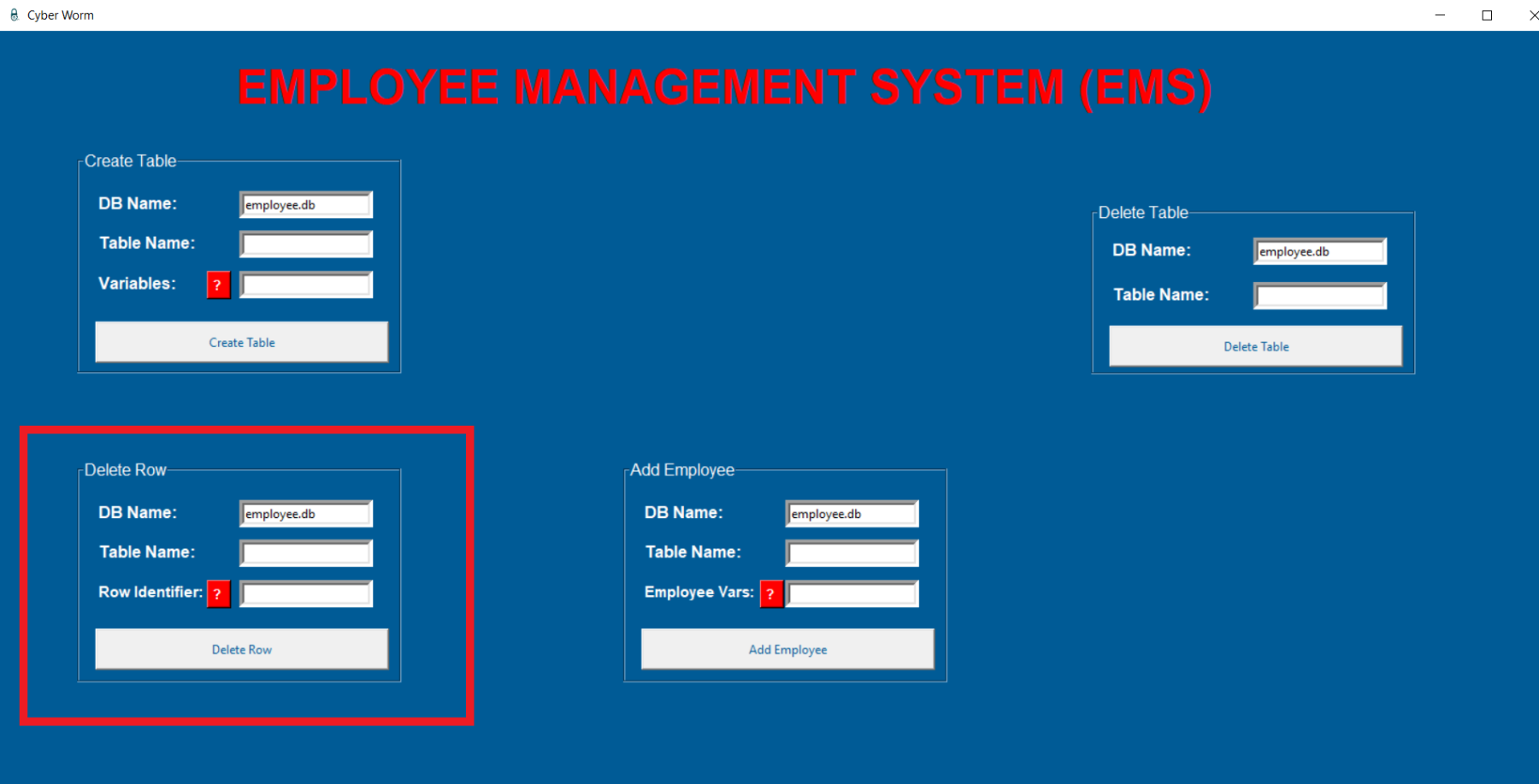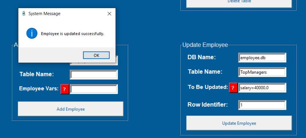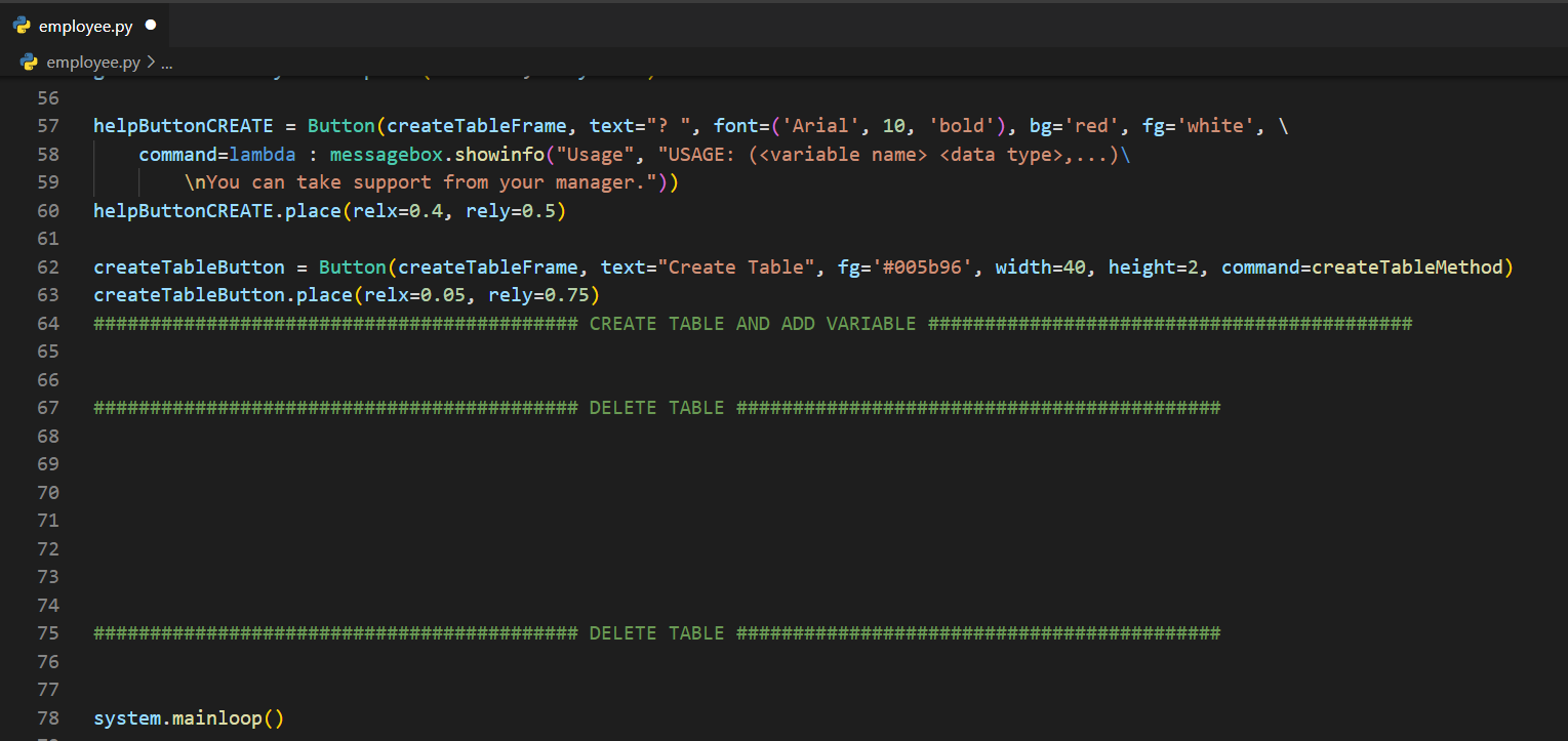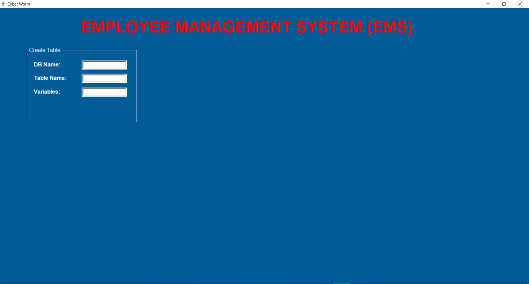 employee.pyfrom tkinter import *from tkinter import messageboximport sqlite3import webbrowser as websystem = Tk()system.geometry("1920x1080")system.title("Cyber Worm")system.iconbitmap("C:/Python/EMS/logo.ico")system.configure(bg="#005b96")#system.attributes('-fullscreen', True)defaultDatabase = StringVar()defaultDatabase.set("employee.db")titleLabel = Label(system, text="EMPLOYEE MANAGEMENT SYSTEM (EMS)", bg='#005b96', fg='red', font=('Arial', 35, 'bold'))titleLabel.place(relx=0.15, rely=0.03)########################################### CREATE TABLE AND ADD VARIABLE ###########################################def createTableMethod(): try: databaseName = getDbNameEntryCREATE.get() tableName = getTableNameEntryCREATE.get() variables = getVariablesEntryCREATE.get() connection = sqlite3.connect(f'{databaseName}') cursor = connection.cursor() cursor.execute(f"CREATE TABLE IF NOT EXISTS {tableName} {variables}") connection.commit() connection.close() return messagebox.showinfo("System Message", "Table is created successfully.") except: return messagebox.showerror("System Message", "Something went wrong.")createTableFrame = LabelFrame(system, text="Create Table", fg='white', bg='#005b96', font=('Arial', 12), height=220, width=320)createTableFrame.place(relx=0.05, rely=0.14)getDbNameEntryCREATE = Entry(createTableFrame, textvariable=defaultDatabase, border=5)getDbNameEntryCREATE.place(relx=0.5, rely= 0.1)getDbNameLabelCREATE = Label(createTableFrame, text="DB Name:", bg='#005b96', fg='white', font=('Arial', 12, 'bold'))getDbNameLabelCREATE.place(relx=0.05, rely=0.1)getTableNameEntryCREATE = Entry(createTableFrame, border=5)getTableNameEntryCREATE.place(relx=0.5, rely= 0.3)getTableNameLabelCREATE = Label(createTableFrame, text="Table Name:", bg='#005b96', fg='white', font=('Arial', 12, 'bold'))getTableNameLabelCREATE.place(relx=0.05, rely=0.3)getVariablesLabelCREATE = Label(createTableFrame, text="Variables:", bg='#005b96', fg='white', font=('Arial', 12, 'bold'))getVariablesLabelCREATE.place(relx=0.05, rely=0.5)getVariablesEntryCREATE = Entry(createTableFrame, border=5)getVariablesEntryCREATE.place(relx=0.5, rely= 0.5)helpButtonCREATE = Button(createTableFrame, text="? ", font=('Arial', 10, 'bold'), bg='red', fg='white', \ command=lambda : messagebox.showinfo("Usage", "USAGE: (<variable name> <data type>,...)\ \nYou can take support from your manager."))helpButtonCREATE.place(relx=0.4, rely=0.5)createTableButton = Button(createTableFrame, text="Create Table", fg='#005b96', width=40, height=2, command=createTableMethod)createTableButton.place(relx=0.05, rely=0.75)########################################### CREATE TABLE AND ADD VARIABLE ###################################################################################### DELETE TABLE ###########################################def dropTable(): try: databaseName = getDbNameEntry_DropTable.get() tableName = getTableNameEntry_DropTable.get() connection = sqlite3.connect(f'{databaseName}') cursor = connection.cursor() cursor.execute(f"DROP TABLE {tableName}") connection.commit() connection.close() return messagebox.showinfo("System Message", "Table is deleted successfully.") except: return messagebox.showerror("System Message", "Something went wrong.")dropTableFrame = LabelFrame(system, text="Delete Table", fg='white', bg='#005b96', font=('Arial', 12), height=170, width=320) dropTableFrame.place(relx=0.7, rely=0.2)getDbNameEntry_DropTable = Entry(dropTableFrame, textvariable=defaultDatabase, border=5)getDbNameEntry_DropTable.place(relx=0.5, rely= 0.1)getDbNameLabel_DropTable = Label(dropTableFrame, text="DB Name:", bg='#005b96', fg='white', font=('Arial', 12, 'bold'))getDbNameLabel_DropTable.place(relx=0.05, rely=0.1)getTableNameEntry_DropTable = Entry(dropTableFrame, border=5)getTableNameEntry_DropTable.place(relx=0.5, rely= 0.4)getTableNameLabel_DropTable = Label(dropTableFrame, text="Table Name:", bg='#005b96', fg='white', font=('Arial', 12, 'bold'))getTableNameLabel_DropTable.place(relx=0.05, rely=0.4)dropTableButton = Button(dropTableFrame, text="Delete Table", fg='#005b96', width=40, height=2, command=dropTable)dropTableButton.place(relx=0.05, rely=0.69)########################################### DELETE TABLE ###################################################################################### DELETE ROW ###########################################def deleteRow(): try: databaseName = getDbNameEntry_DeleteRow.get() tableName = getTableNameEntry_DeleteRow.get() rowIdentifier = getRowEntry_DeleteRow.get() connection = sqlite3.connect(f'{databaseName}') cursor = connection.cursor() cursor.execute(f"DELETE FROM {tableName} WHERE ROWID={int(rowIdentifier)}") connection.commit() connection.close() return messagebox.showinfo("System Message", f"Employee is removed from {tableName} successfully.") except: return messagebox.showerror("System Message", "Something went wrong.")deleteRowFrame = LabelFrame(system, text="Delete Row", fg='white', bg='#005b96', font=('Arial', 12), height=220, width=320) deleteRowFrame.place(relx=0.05, rely=0.5)getDbNameEntry_DeleteRow = Entry(deleteRowFrame, textvariable=defaultDatabase, border=5)getDbNameEntry_DeleteRow.place(relx=0.5, rely= 0.1)getDbNameLabel_DeleteRow = Label(deleteRowFrame, text="DB Name:", bg='#005b96', fg='white', font=('Arial', 12, 'bold'))getDbNameLabel_DeleteRow.place(relx=0.05, rely=0.1)getTableNameEntry_DeleteRow = Entry(deleteRowFrame, border=5)getTableNameEntry_DeleteRow.place(relx=0.5, rely= 0.3)getTableNameLabel_DeleteRow = Label(deleteRowFrame, text="Table Name:", bg='#005b96', fg='white', font=('Arial', 12, 'bold'))getTableNameLabel_DeleteRow.place(relx=0.05, rely=0.3)getRowEntry_DeleteRow = Entry(deleteRowFrame, border=5)getRowEntry_DeleteRow.place(relx=0.5, rely=0.5)getRowLabel_DeleteRow = Label(deleteRowFrame, text="Row Identifier:", bg='#005b96', fg='white', font=('Arial', 11, 'bold'))getRowLabel_DeleteRow.place(relx=0.05, rely=0.5)helpButton_DeleteRow = Button(deleteRowFrame, text="? ", font=