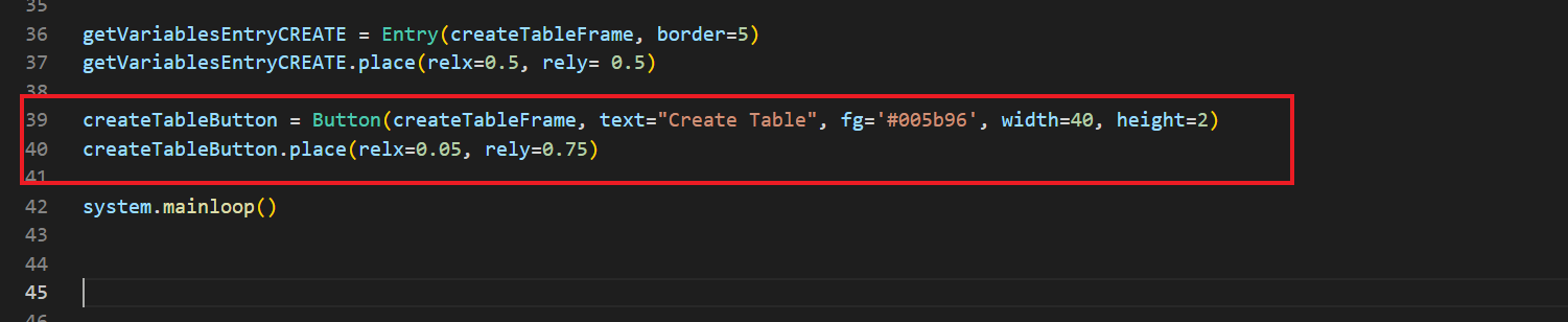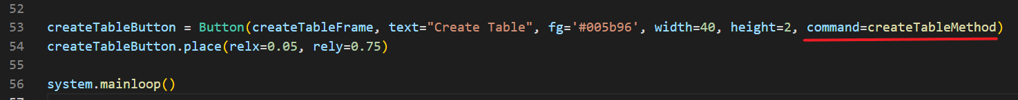 createTableButton isminde bir buton oluşturdum ve onu, Button(createTableFrame) diyerek çerçevenin içine koydum. Sonrasında zaten konumu, büyüklüğü size kalmış. Bu kod sonucunda şöyle bir görüntü bizi bekliyor olacak: