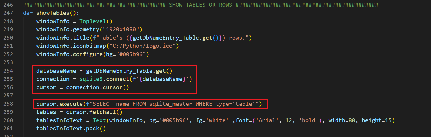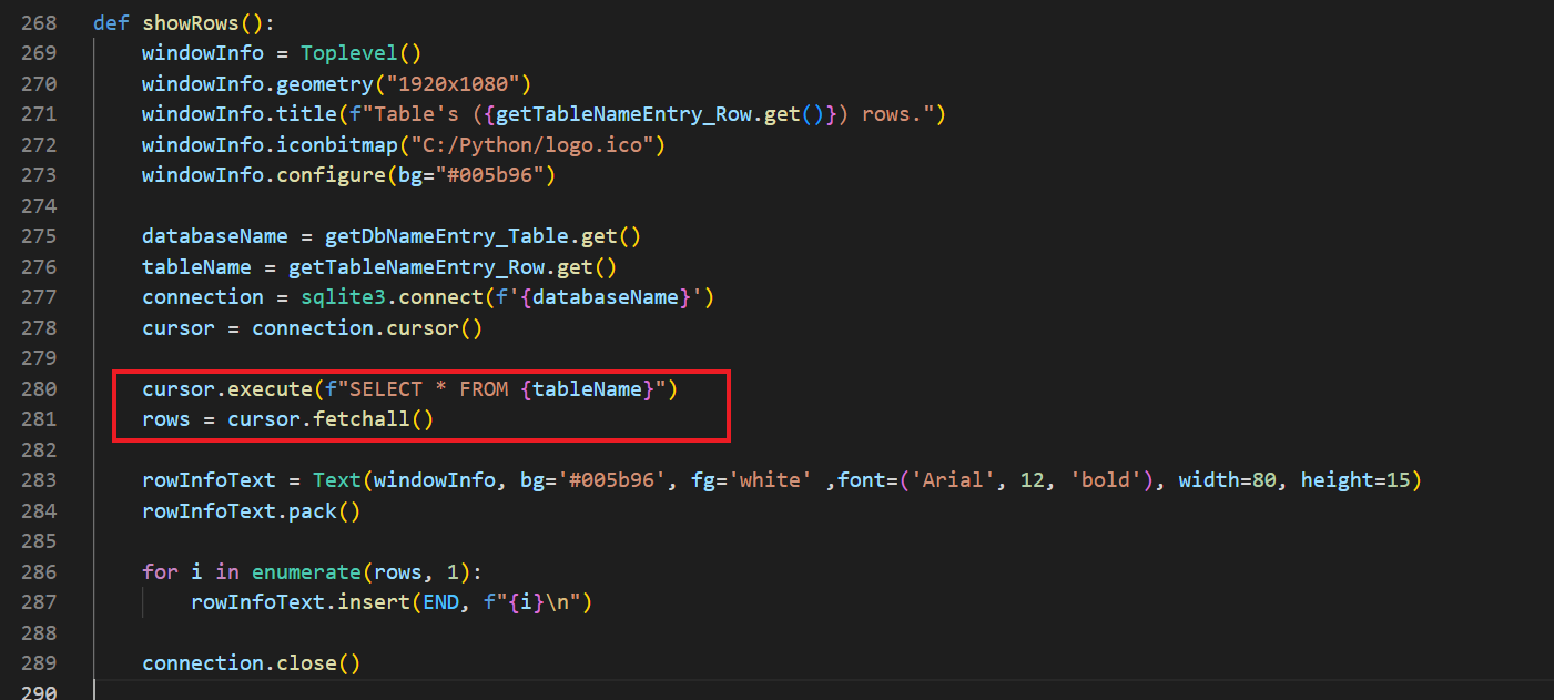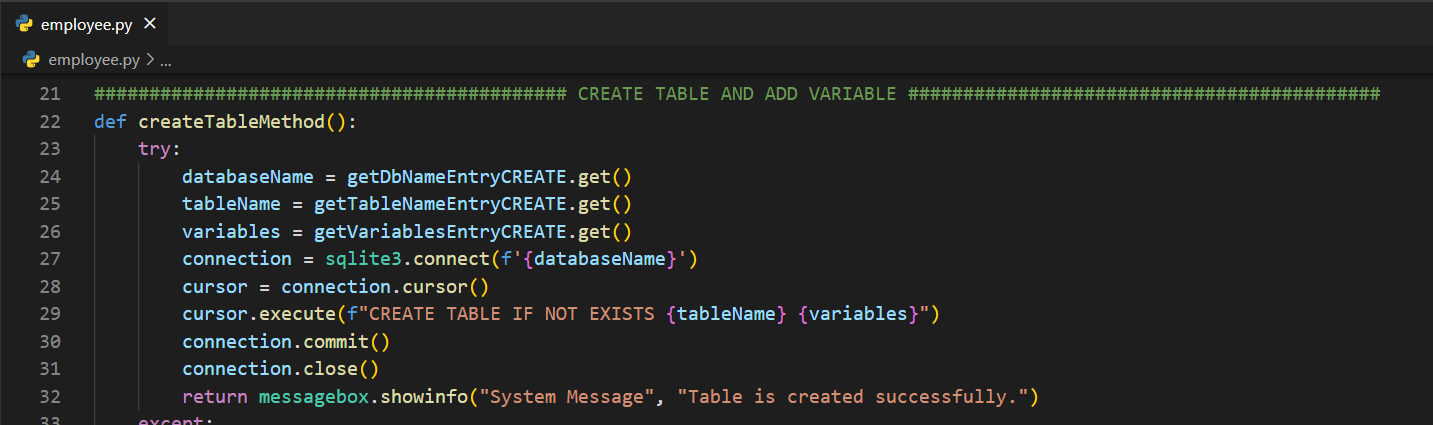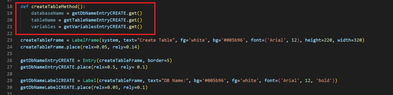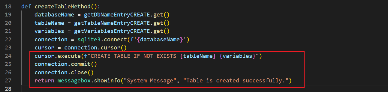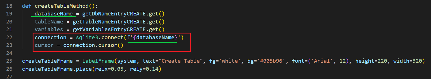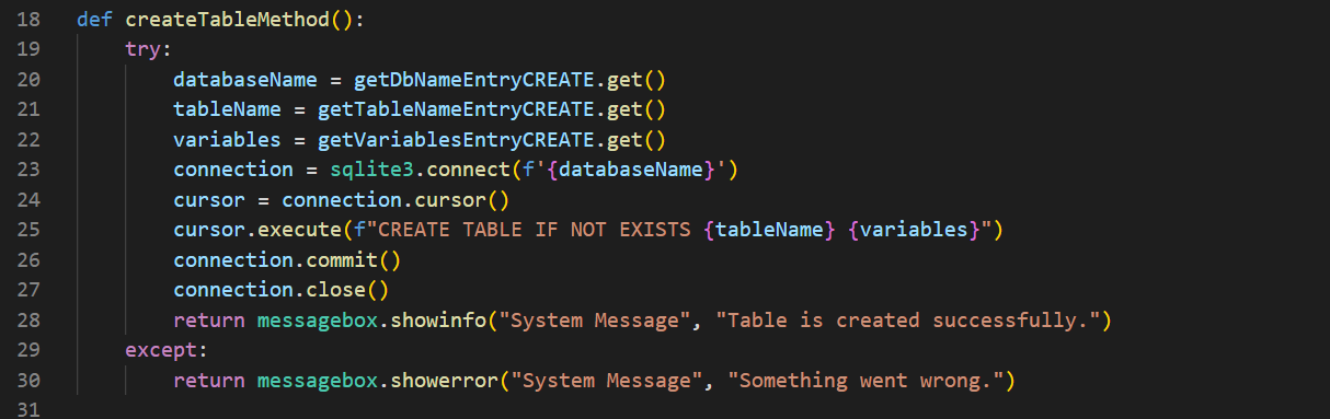 Tablo oluştururken yaptığım gibi direkt olarak try-except bloklarını kullandım. Sonrasında iki adet Entry nesnesine girilen verileri get() ile alıp databaseName ve tableName değişkenlerine atadım.