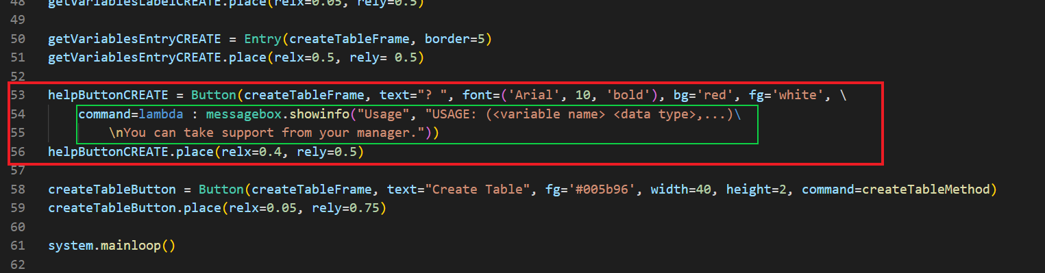 helpButtonCreate ismini verdiğim bu butonda her şeyi biliyorsunuz. Fakat bizim, bir uyarı vermemiz lazım ve bu uyarıyı normal şartlarda bir fonksiyon içerisine tanımlıyoruz. Dikkatli bakarsanız bunun bir saçmalıktan ibaret olduğunu görebilirsiniz. Yeşil kutuya bakalım; command=help dediğimizi ve help() fonksiyonunun şuna benzediğini düşünün: