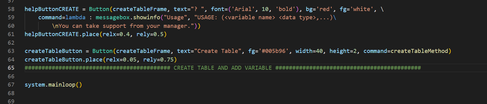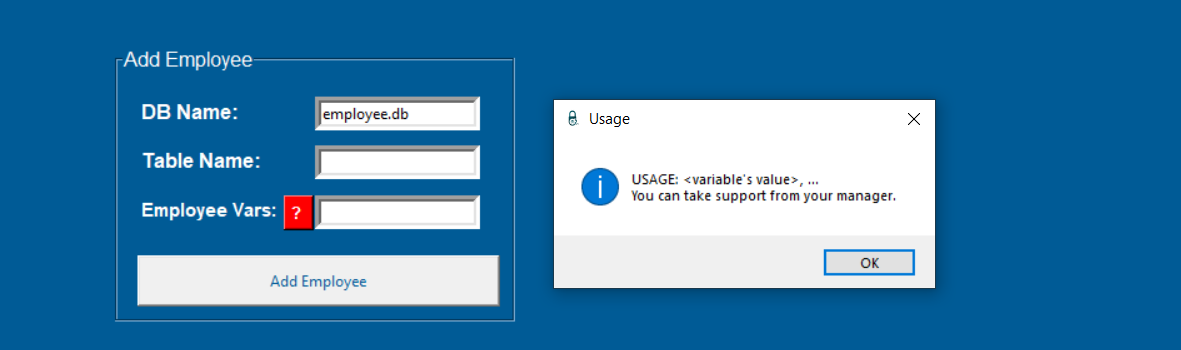 return messagebox.showinfo("Usage", "USAGE (<variable name> <data type>, ...) \