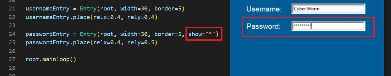 if passwordEntry.get() == passwd[0][0] yani eğer kullanıcının girdiği parola değeri passwd[0][0] değerine eşitse... şeklinde bir koşul belirttik ve bu koşulun gerçekleşmesi durumunda "Successfully logged in" şeklinde bir mesaj verdik. Gerçekleşmemesi durumunda ise "Username or password is wrong" şeklinde bir mesaj verdik.
