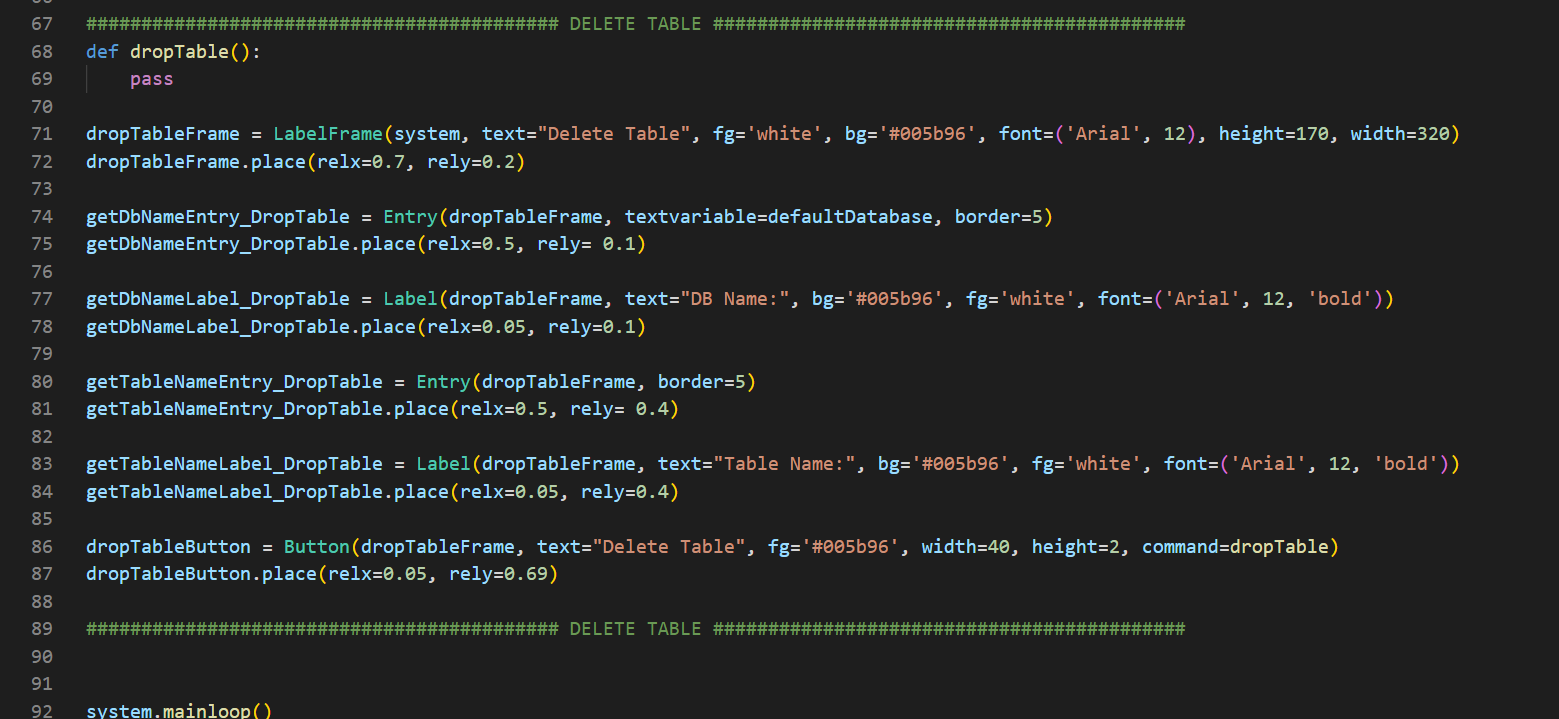 Şimdi, bir çerçeve oluşturuyorum ve adını dropTableFrame koyuyorum. Unutmuyoruz; tanımlayıcı olacaklar. Bunu dedikten sonra LabelFrame(system) diyerek bunu, system isimli arayüzün içine atıyorum. Sonrasında 2 adet Entry ve 2 adet Label koyuyorum ve bunların konumlarını, renklerini belirliyorum.