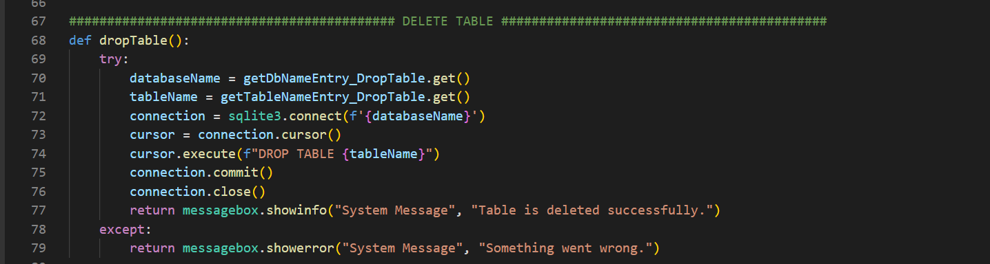 86-87. satırlarda ise butonumuz mevcut. Bu noktada butonumuza command=dropTable diyerek dropTable isimli fonksiyonu verdik. Bu fonksiyon, en başta zaten tanımlı hâlde bekliyor. Şimdi bu fonksiyonu da yazacağız.