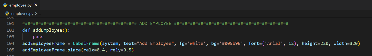 addEmployee() isminde bir fonksiyon oluşturdum ve hemen altına addEmployeeFrame isminde yeni bir çerçeve yarattım. Şimdi, kalan nesneleri de yazalım.