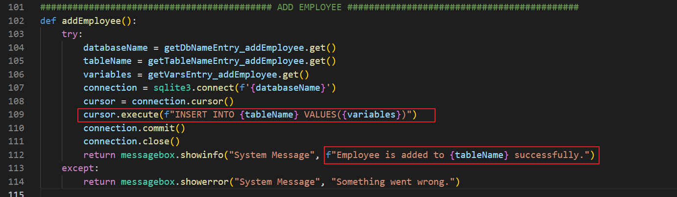 Genel olarak hepsi aynı mantıkta. Yalnızca dikkat edelim; ilk kırmızı kutuda VALUES(...) olarak girmemiz gerektiği için VALUES({}) şeklinde bir kullanım sağladım. Bu noktada kullanıcı değer girerken parantez işaretlerini koymak zorunda kalmayacaktır. İkinci kırmızı kutuda ise messagebox içerisine de fstring yapısını entegre edebildiğimizi görebiliyorsunuz. Burada tablo ismi güncel ve dinamik olarak yazılacaktır.