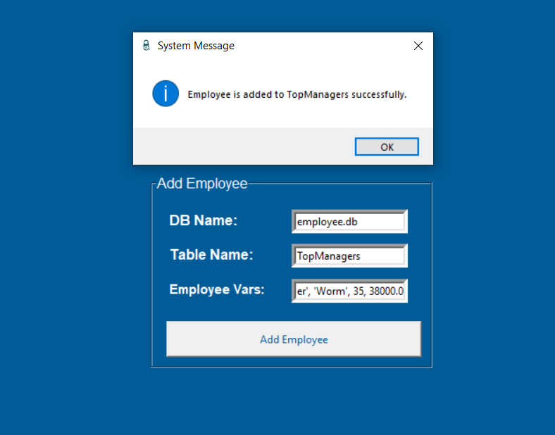 Employee Vars: kısmına sırasıyla 'Cyber', 'Worm', 35, 38000.0 değerlerini girdim ve işlemin başarıyla sonuçlandığına dair bir bildirim aldım. Bir de veri tabanına bakalım.