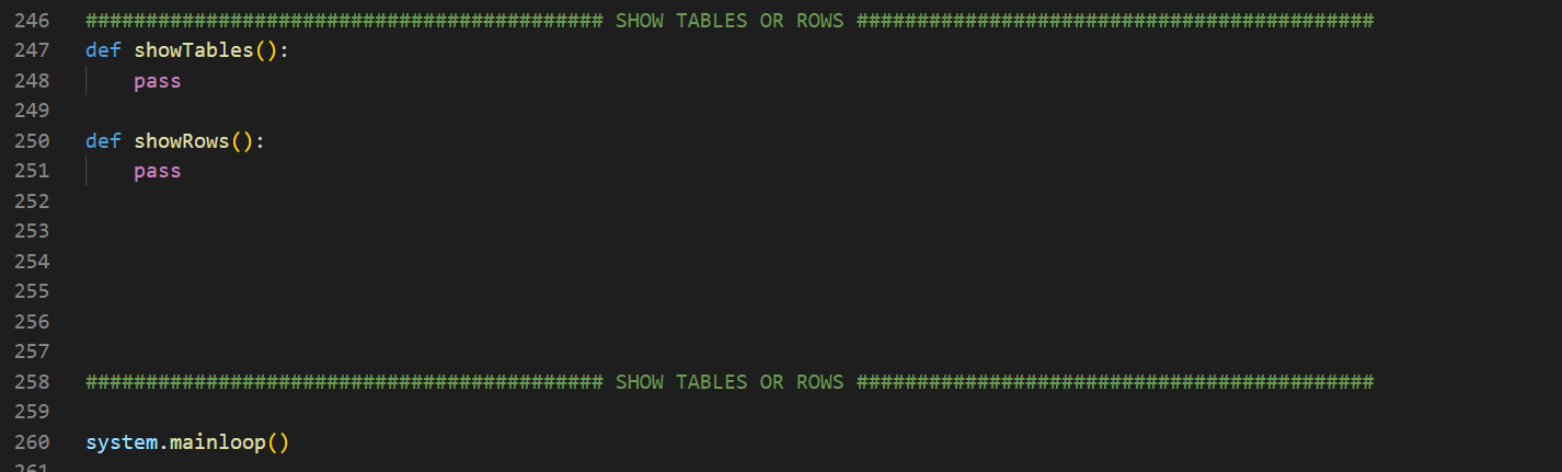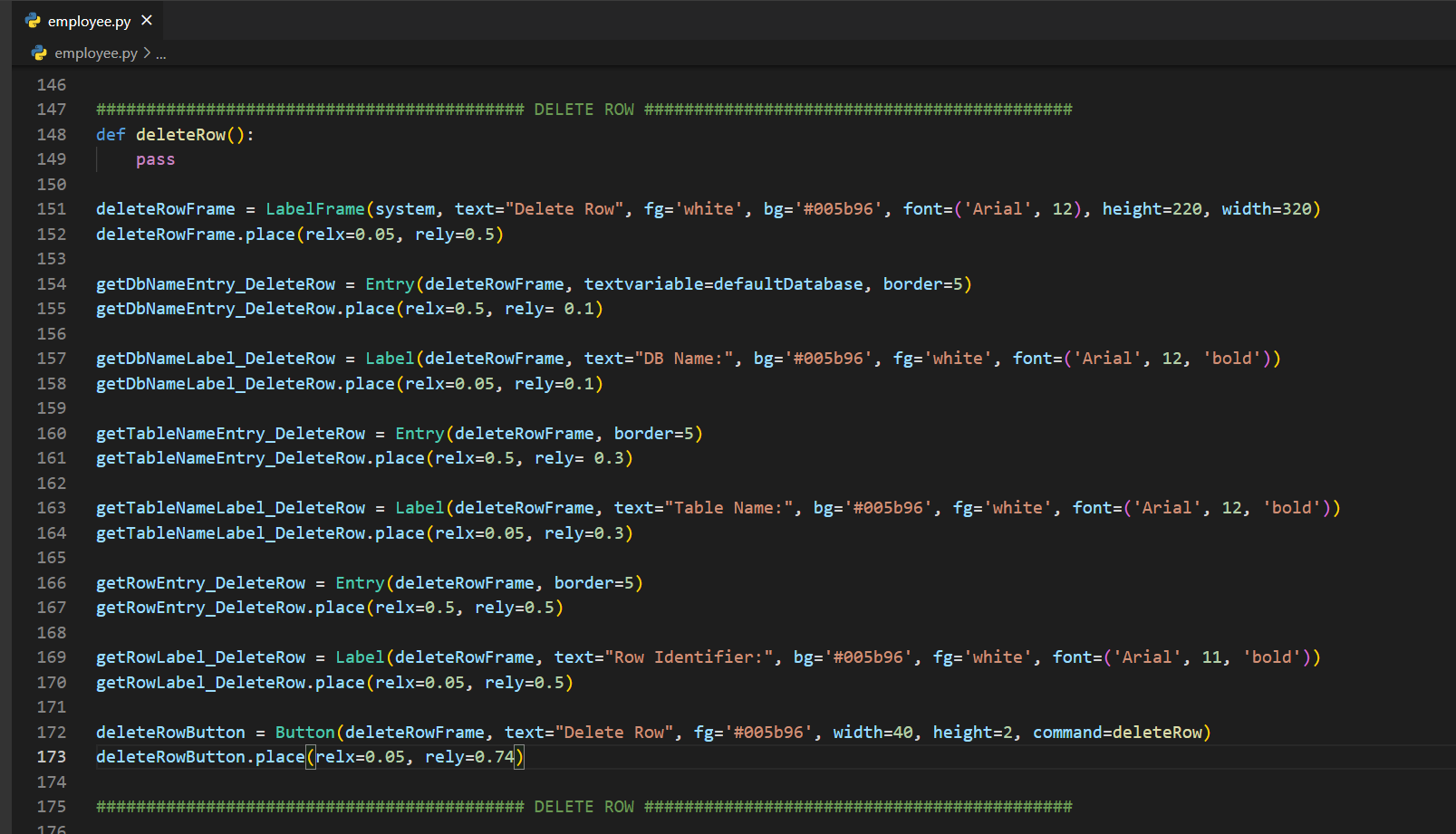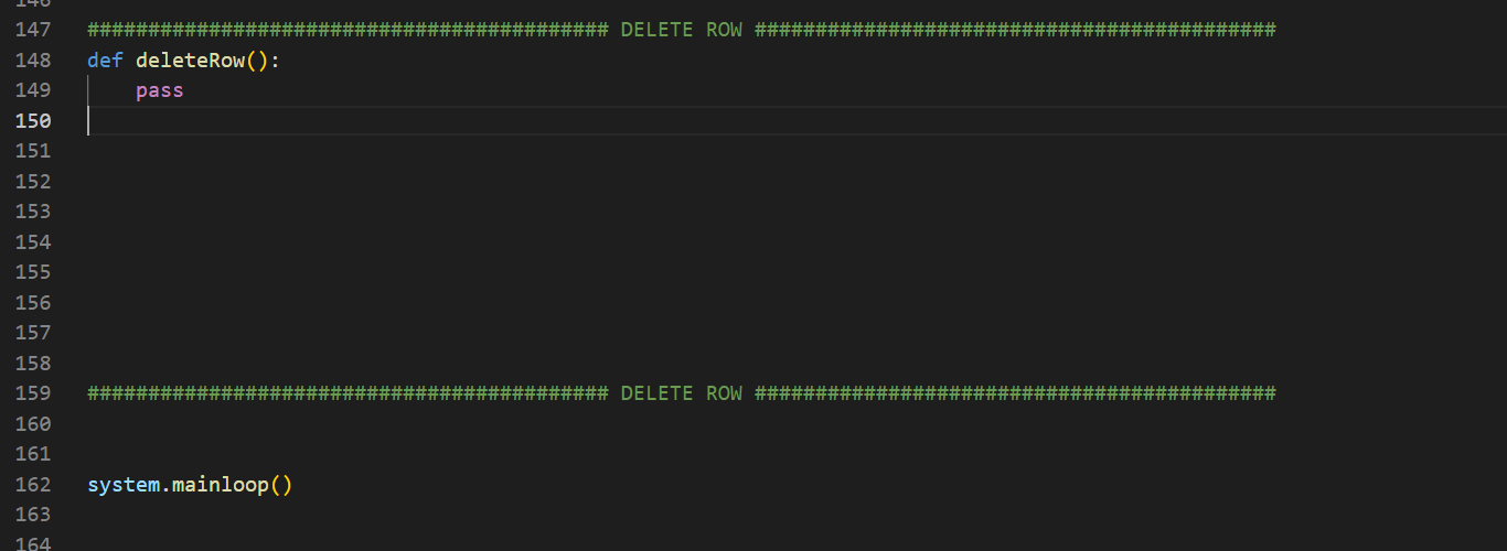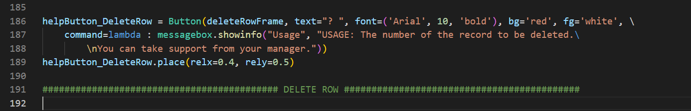 Bütün nesneleri, deleteRowFrame isimli çerçevenin içine koyduk. Yine veri tabanını istediğimiz Entry nesnesine textvariable=defaultDatabase diyerek varsayılan bir değer atadık. Son olarak; butonumuza deleteRow fonksiyonunu verdik. Şimdi, fonksiyonu yazacağız.