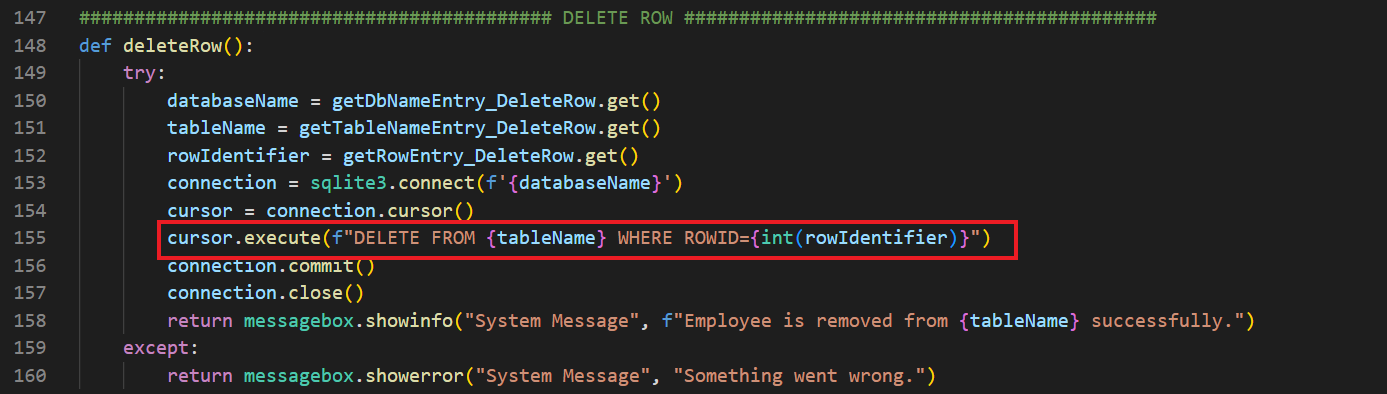 cursor.execute(f"DELETE FROM {tableName} WHERE ROWID={int(rowIdentifier)}" komutunu girdik. Bu noktada kullanıcı tablo ismi için TopManagers girerse ve 1. satırdaki kişiyi silmek isterse komut şu hâle dönecektir: