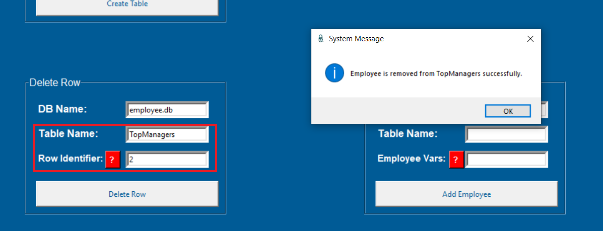 Bu noktada aslında "TopManagers tablosunun birinci satırını sil" demiş oluyoruz ve bunu ROWID ile yapıyoruz. Biz, ROWID=1 demek yerine örneğin name='Cyber' demeyi öğrendik. Ancak, gördüğünüz üzere bu kullanım da oldukça mümkündür. Fakat lütfen dikkat edelim; alacağımız girdiye int() diyerek Type Conversion uyguluyoruz, kullanmasanız da olur ama kullanırsanız daha stabil çalışır. Row Identifier: şeklinde bir Label oluşturmuştuk ama kullanıcı bunun ne olduğunu bilmiyor ya da unutmuş olabilir. O yüzden oraya bir yardım butonu koyabiliriz:
