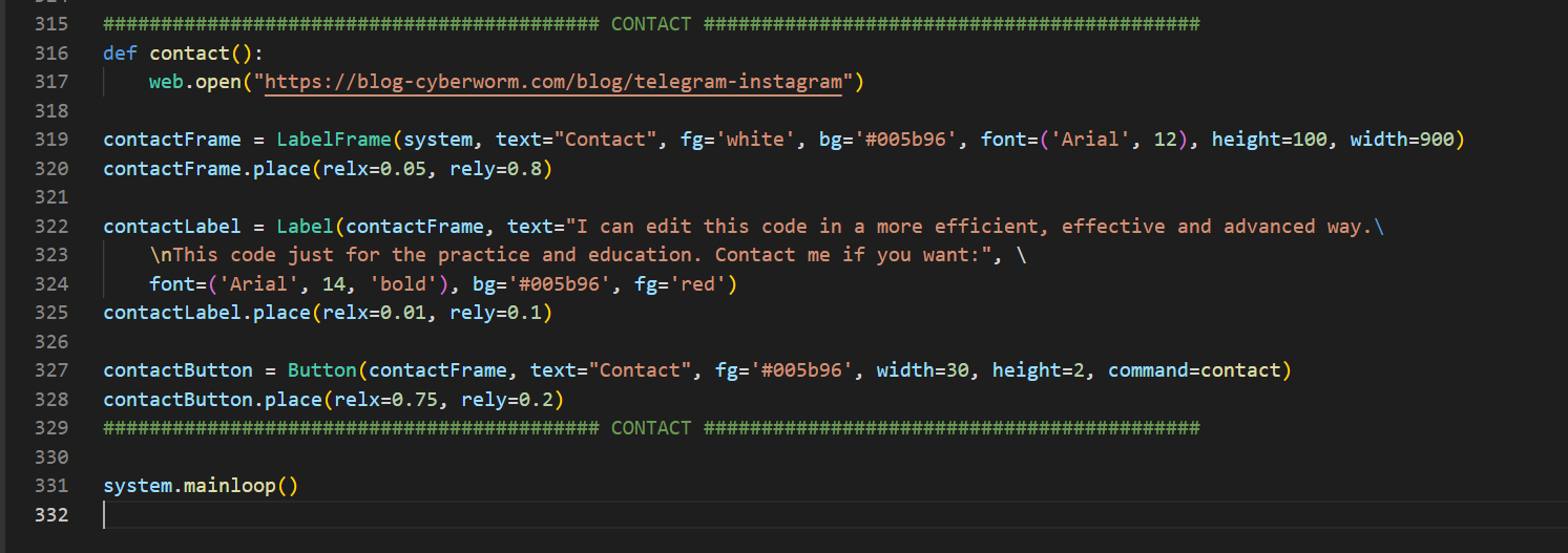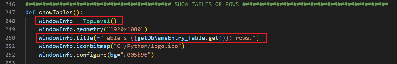 Butona basıldığında yeni bir pencere açılmasını istediğim için TopLevel() kullandım; bunu daha önce gördünüz. Açtığım yeni pencere de bir nesne olduğu için root, system gibi ona da bir isim verdim ve bu fonksiyon içerisinde olan biten her şey windowInfo nesnesi üzerinden yürüyecek. İkinci kırmızı kutuda, pencerenin başlığına değişken koyabildiğimizi görüyorsunuz. Gerisi bildiğiniz şeyler.