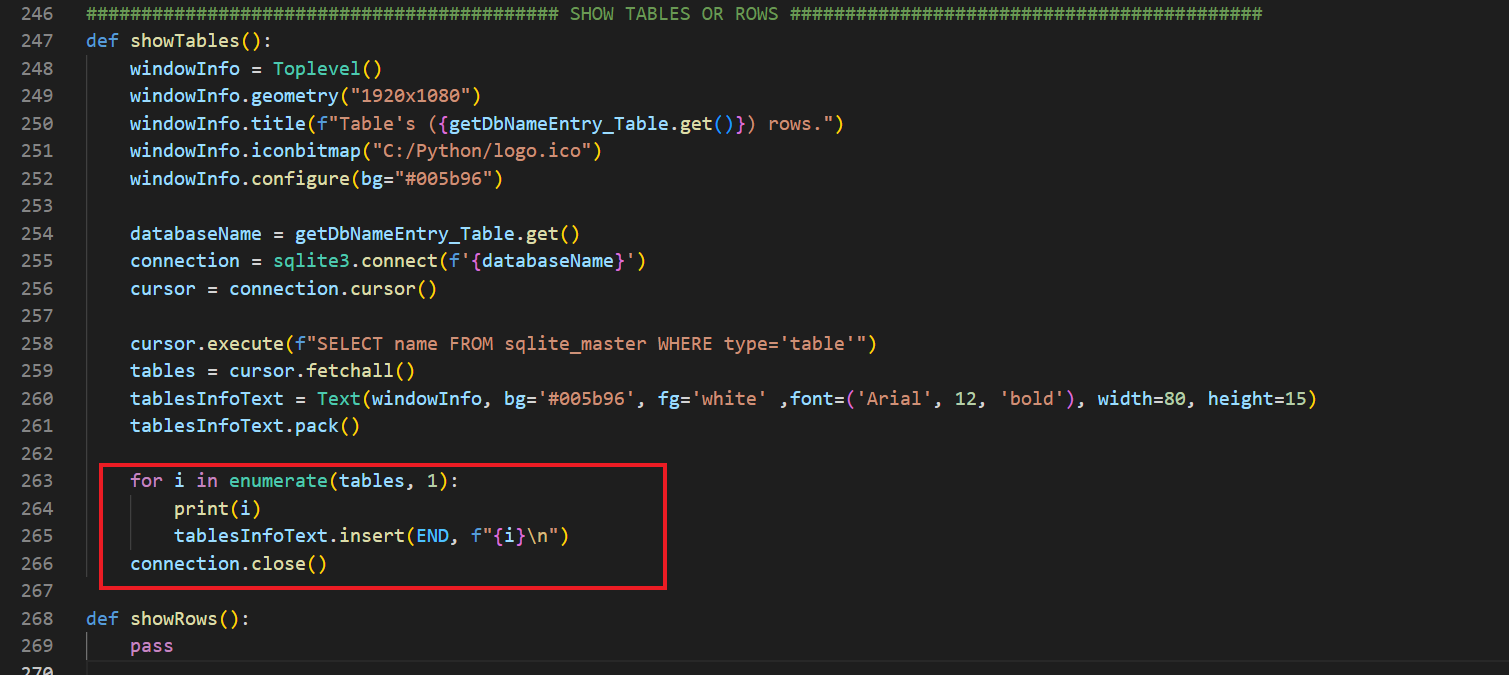 Son olarak, tablesInfoText.insert(END, f"{i}\n") ifadesini görüyorsunuz. insert() metodu, ifadeler arasına karakter yerleştirmeye olanak tanır. Bu noktada biz de Text nesnesine for döngüsü ile kontrol ettiğimiz tablo isimlerini yerleştirdik (i) ve \n özel kaçış karakteri ile bunların alt alta girilmesini sağladık.